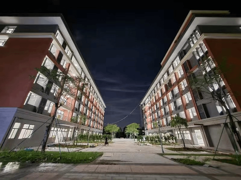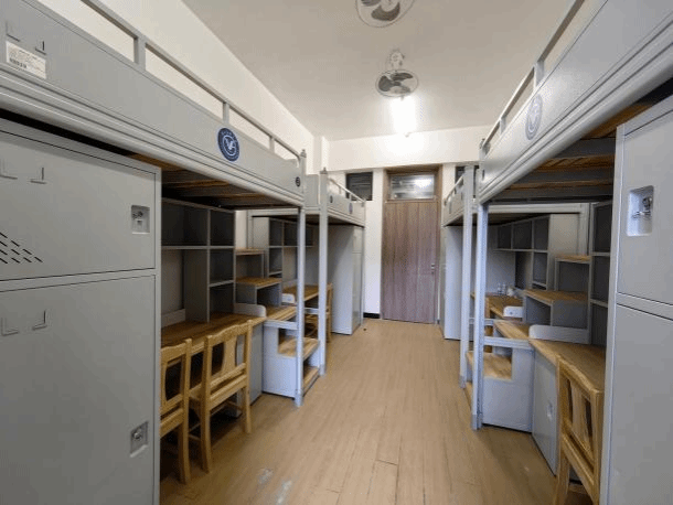 These dormitories are independent suites furnished with air conditioners, fans, bunk beds, wardrobes, desks, and network ports. Each suite has a hot-water shower system, and on each floor, there are public washing machines and water heaters.