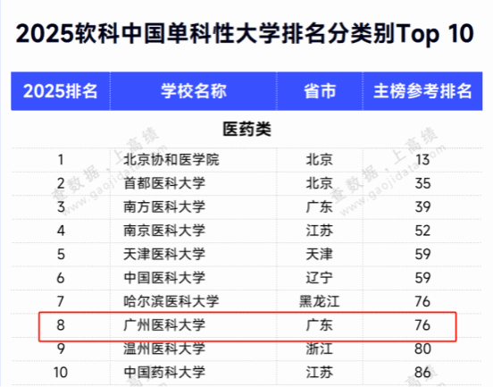 On April 15, ShanghaiRanking released its 2025 Best Chinese Universities Ranking. Guangzhou Medical University(GMU), ranked eighth in the sub-ranking of Chinese medical universities and 76th in the overall list, climbing four places from last year to enter the top ten for the first time.