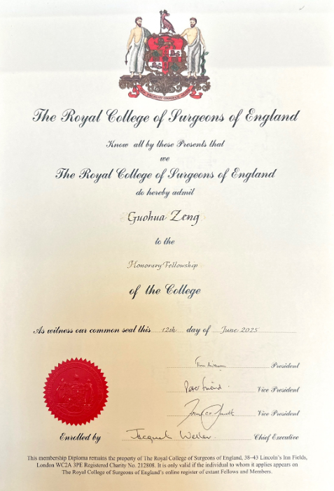 Professor Zeng Guohua, vice president of the First Affiliated Hospital of Guangzhou Medical University and Discipline Leader of Urology, was awarded recently the Honorary Fellowship of the Royal College of Surgeons of England in London. This is the highest academic honor the College bestows upon international experts.