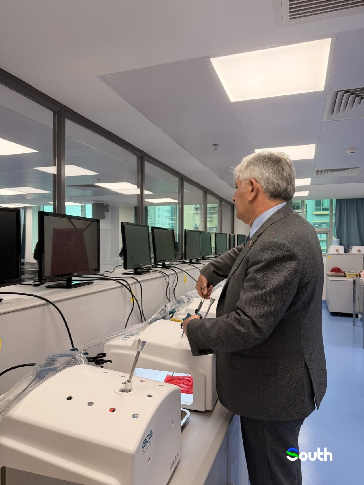 An international participant experiences the endoscopic training equipment of the First Affiliated Hospital of the GMU.